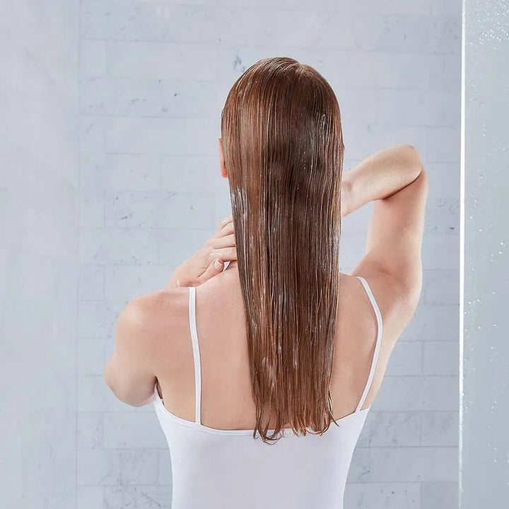بعـد غسـل الشـعر بالشـامبو، أزيلي الماء الزائد وضعي البلسـم عـلى طول الشـعر، مـع تجنـب الجـذور، دلـكي بلطـف واشـطفيه جيـدا.