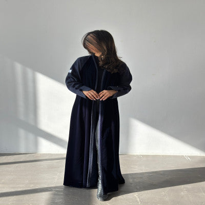 عبايه مخمل مع تدخيلات من الجوخ الملكي على الأكمام والاطراف تعتمدها المرأه الانيقه والعمليه فالشتاء