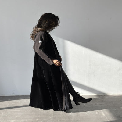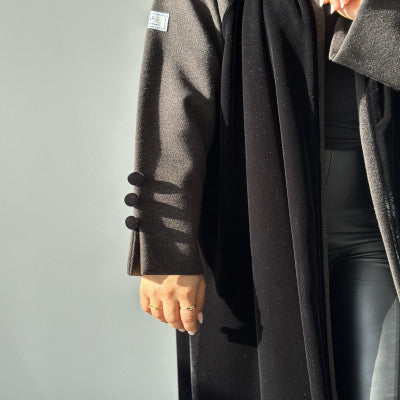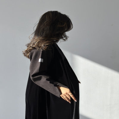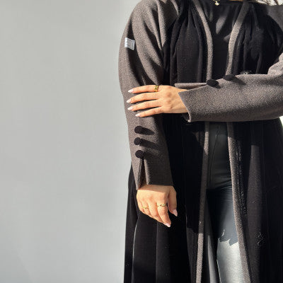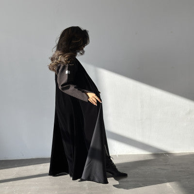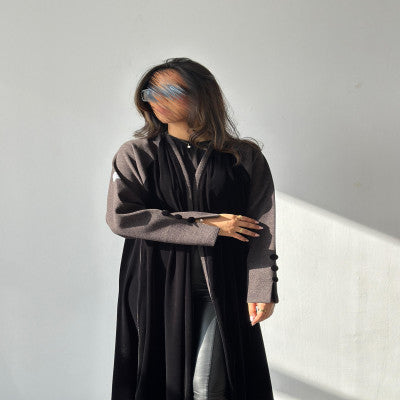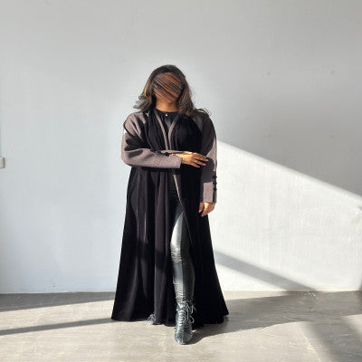 الزاهية E عباية كلوش من المخمل الراقي باللون الاسود والرمادي مع تدخيله خام الجوخ الملكي على الاكمام ، وبقصة انيقه في نهاية الكم
