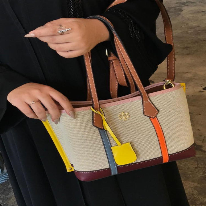 شنطة توري بورش بألوان جريئة وجميلة، مزيج بين القماش البيج الفاخر وجلد ملون بأطراف متعددة (أصفر، عنابي، وردي، أزرق، وبرتقالي). تصميم أنيق وعصري يناسب الطلعات اليومية والمناسبات الخفيفة، وتجي مع سير كتف طويل قابل للفك.