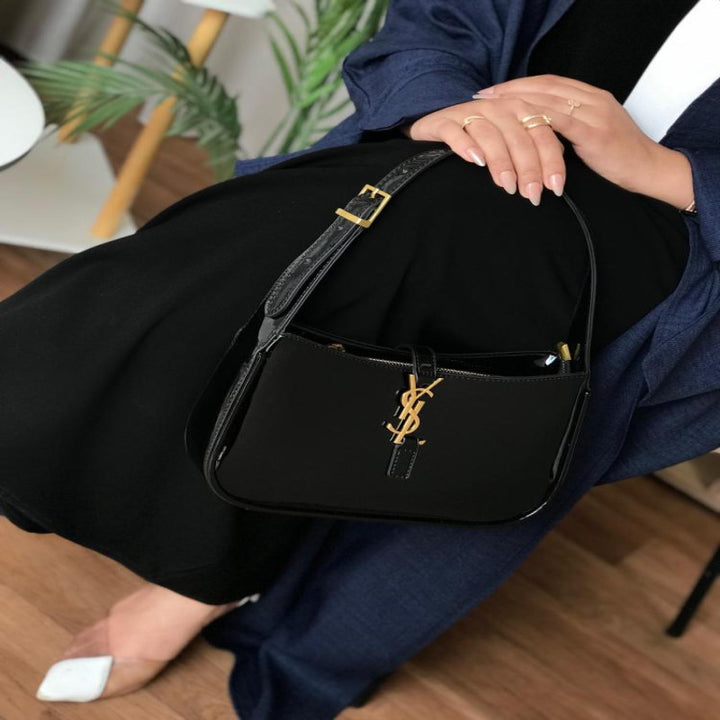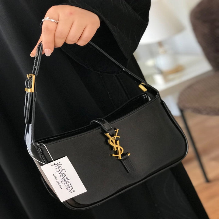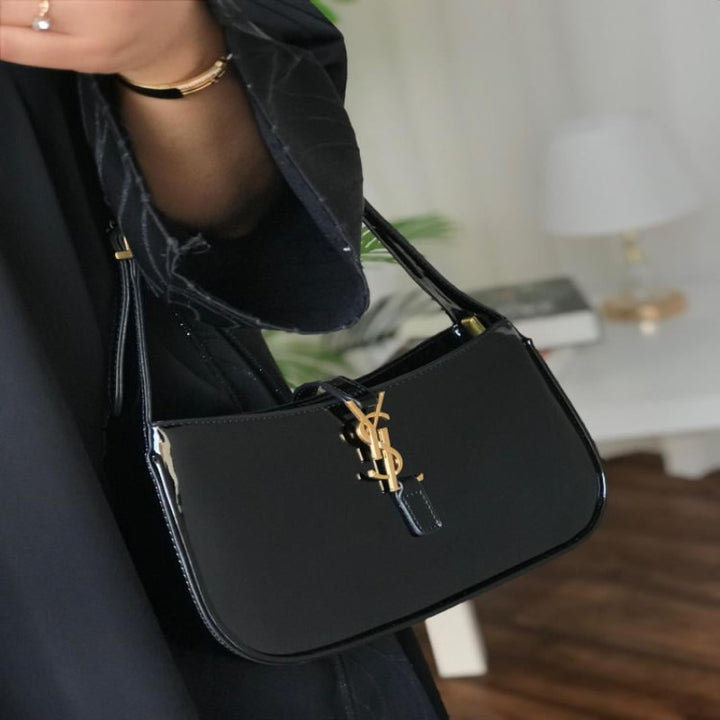 شنطة سان لوران YSL طبق الأصل باللون الاسود اللامع بتصميم فاخر وأنيق، مثالية لكل من تبحث عن لمسة أنوثة فخمة في إطلالتها. مصنوعة من جلد لامع بجودة عالية، مع شعار YSL الذهبي البارز ولمسات تصميم راقية تناسب المناسبات والخروجات.