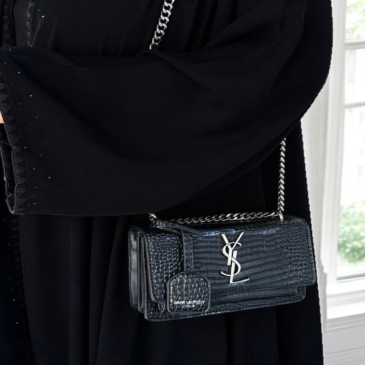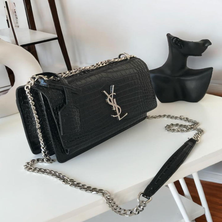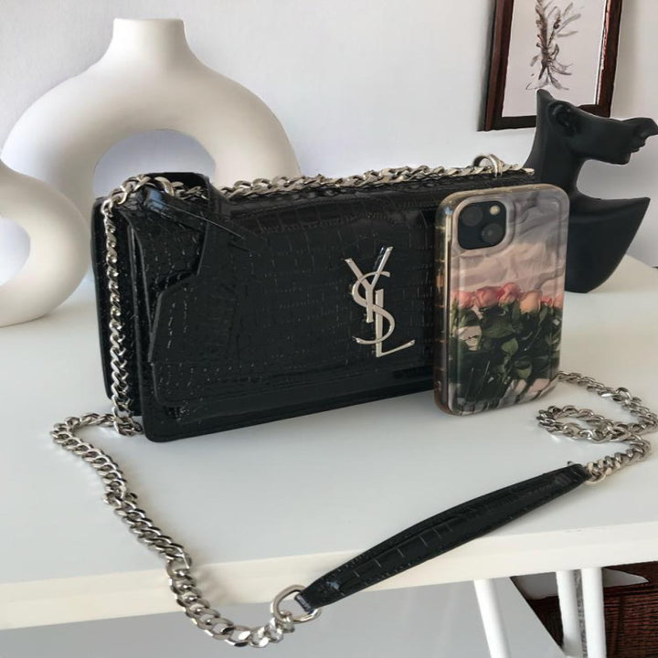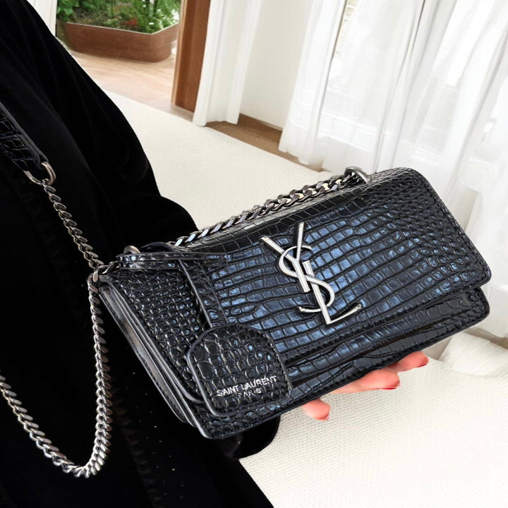 بتصميم فاخر منقوش بلمسة جلد التمساح ولمسة معدنية أنيقة بشعار سان لوران المميزة ، تمنحك إطلالة راقية في كل مناسبة.