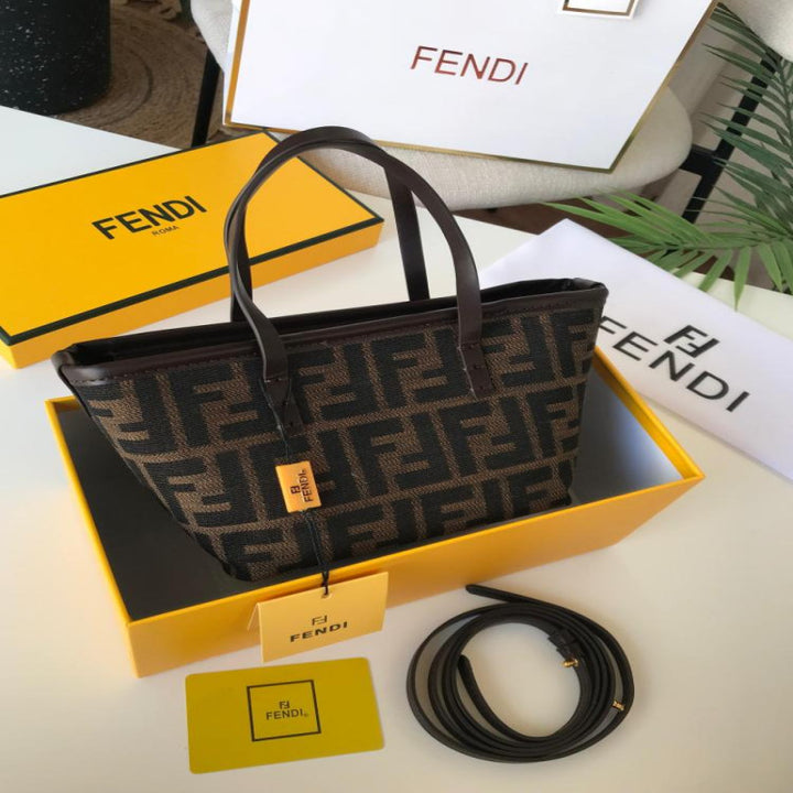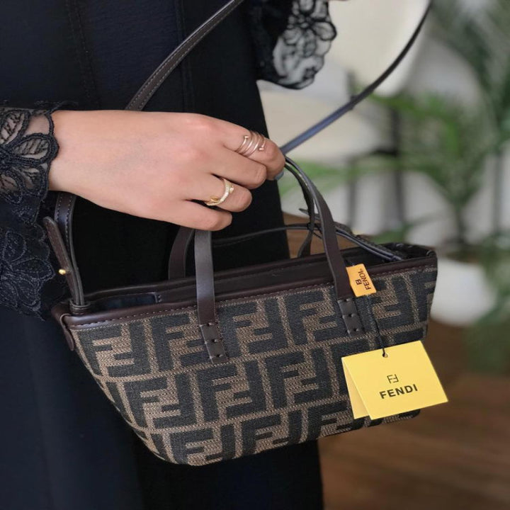 شنطة فندي صغيرة و أنيقة طبق الأصل بتصميم كلاسيكي عملي، بنقشة FF المميزة التي تغطي كامل الشنطة. مصنوعة من خامة عالية الجودة مع يدين للحمل اليدوي وحزام طويل قابل للفصل، مثالية للإطلالة اليومية أو الطلعات الخفيفة.
