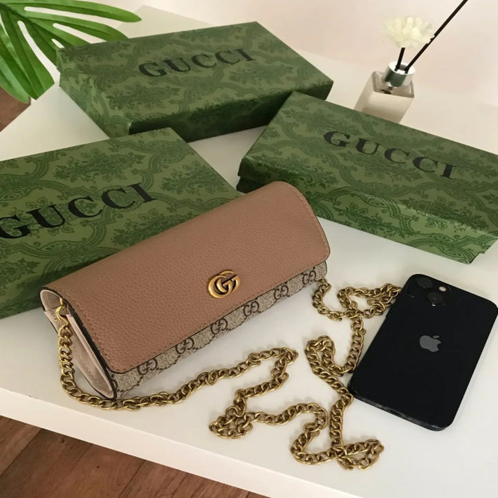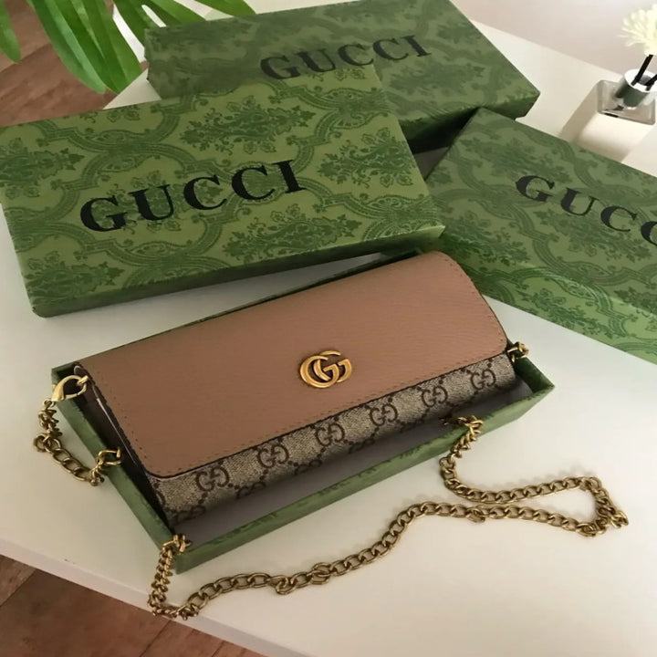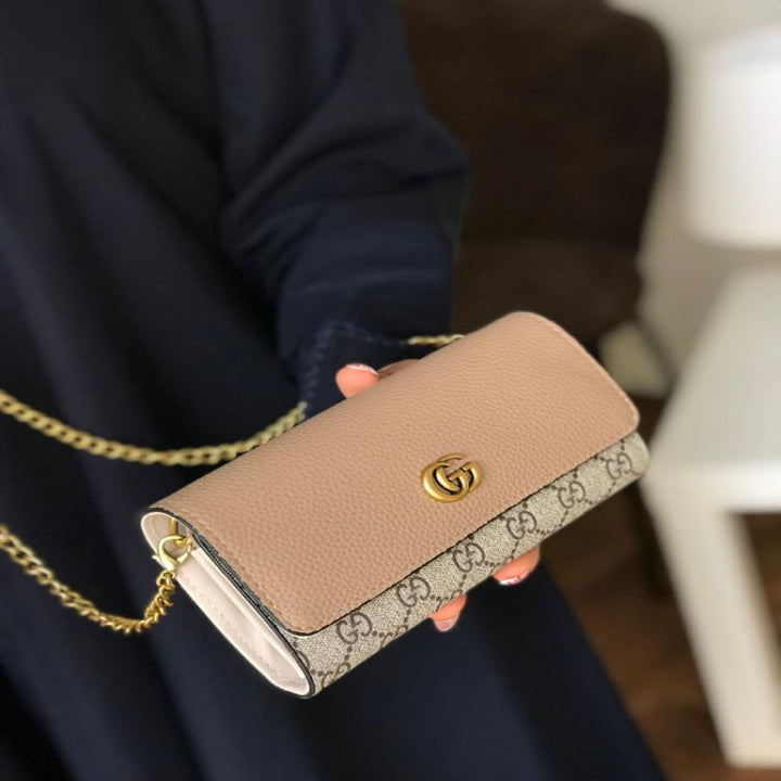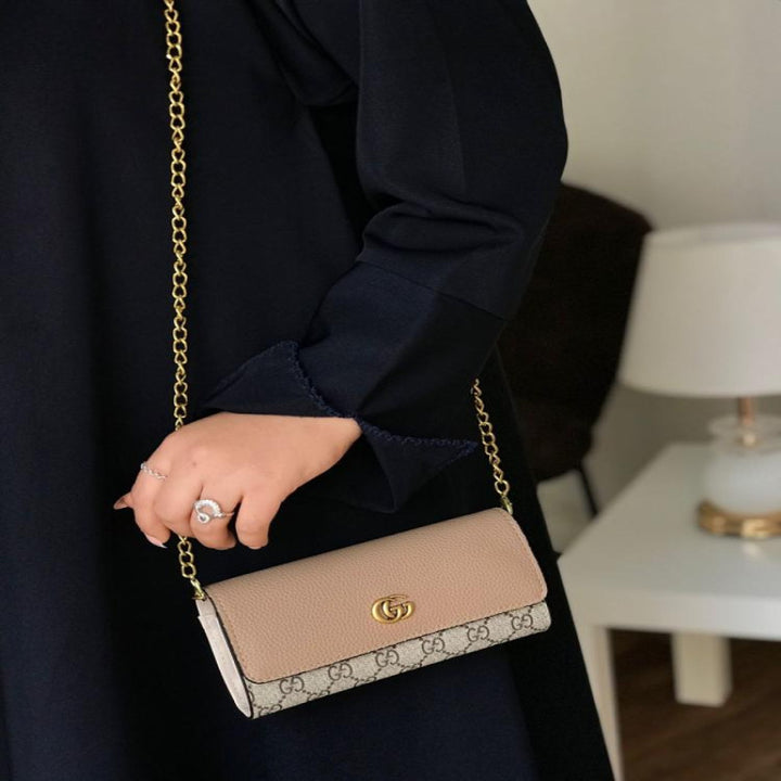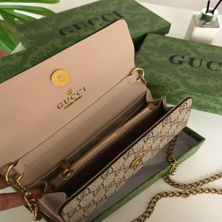 شنطة قوتشي GUCCI ميني – تصميم كلاسيكي بشعار GG شنطة كتف صغيرة من قوتشي Gucci طبق الأصل بتصميم أنيق يجمع بين الجلد البيج الفاخر وقماش GG الشهير. مزوّدة بسلسال ذهبي فاخر يمكن ارتداؤه على الكتف أو كروس، مثالية للسهرات والمشاوير الرسمية.