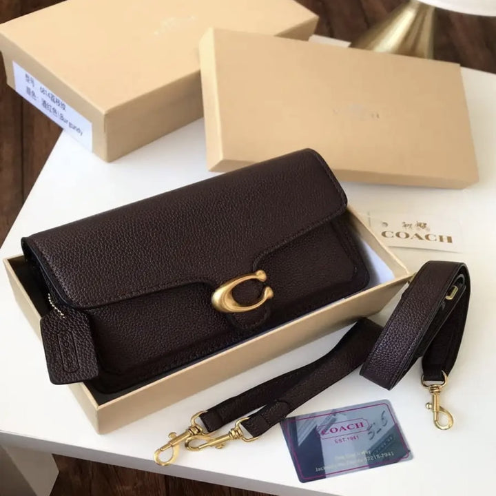 شنطة كوتش تابي COACH طبق الأصل بلون بني داكن أنيق، مصنوعة من جلد فاخر محبب بجودة عالية، تصميم راقي وعملي للإطلالات اليومية والمناسبات. مزودة بإغلاق مغناطيسي بحرف “C” الذهبي الأيقوني، وحزام طويل قابل للتعديل.