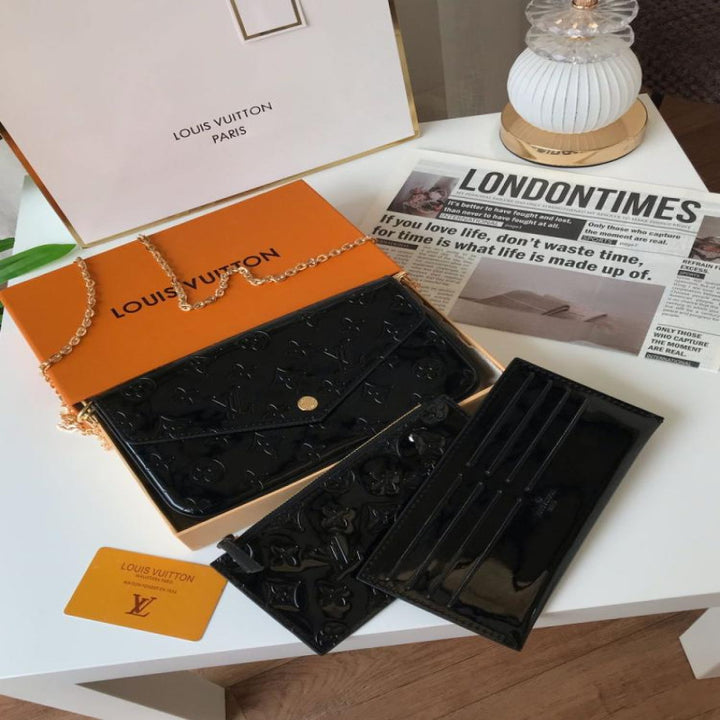 شنطة لويس فيتون Louis Vuitton طبق الأصل بحجم ميني أنيق، مصنوعة من الجلد اللامع الفاخر بنقشة الفي LV الكلاسيكية، وتأتي بثلاث قطع متكاملة: 1. شنطة كروس صغيرة بسلسلة ذهبية 2. محفظة بسحاب بنفس اللون 3. حافظة كروت عملية ومرتبة تصميم راقي يناسب الإطلالات الرسمية والمناسبات الخاصة، بحجم عملي وانيق.