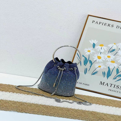 - التفاصيل: شنطة بقماش لامع وبارز باللون الفضي والأزرق بيد دائرية من المعدن وسلسال طويل لإرتداء الشنطة بالطريقة المناسبة لإطلالتك