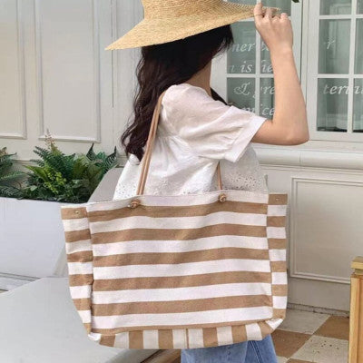 - التفاصيل: شنطة من القماش بتصميم خطوط عرضية تتميز بحجمها الواسع المناسب لإطلالتك اليومية و تتسع لأغراضك في السفر