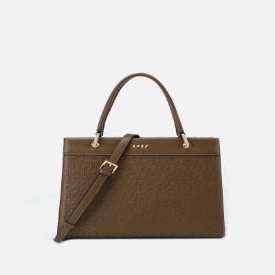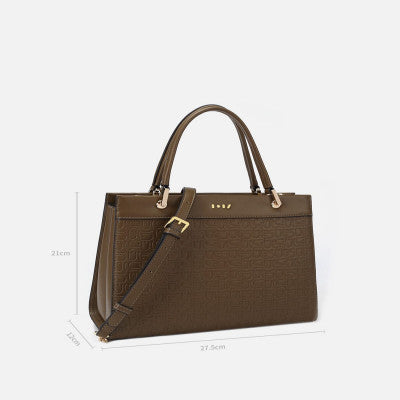 شنطة من الجلد بتفاصيل نقوش باللون البني وبمقاس الطول= 27 سم - العرض= 12 سم - الارتفاع= 21 سم ، تتميز الشنطة بيد مقوسه وحزام عريض مرفق لتتمكني من إرتداء الشنطة بالطريقه المناسبه لك ، يمكنك حمل الشنطه بيدك لإطلاله كلاسيك ، ويمكنك حملها بطريقه الكروس لإطلاله عصريه .