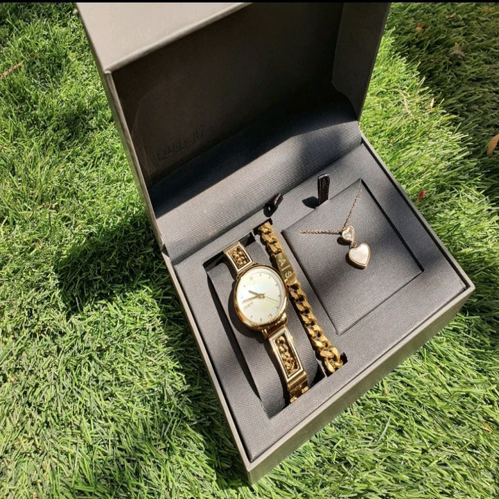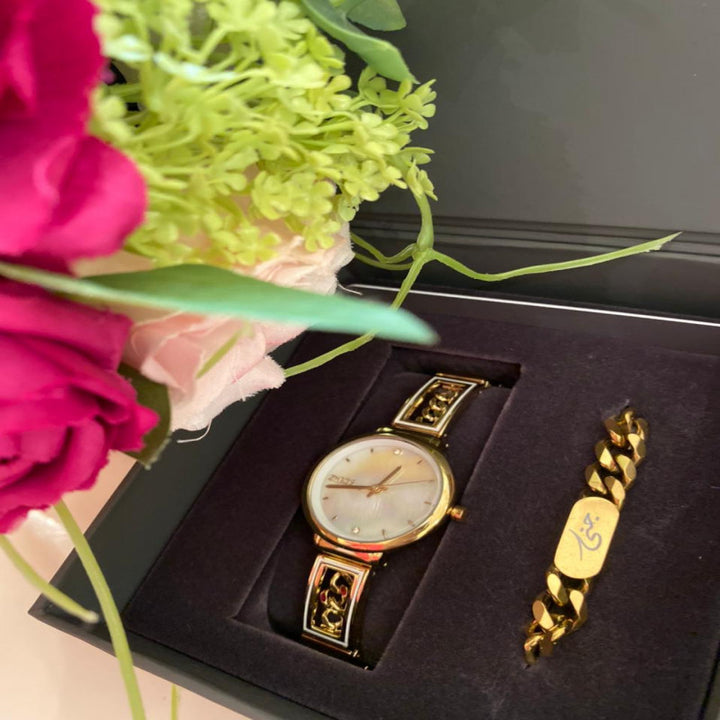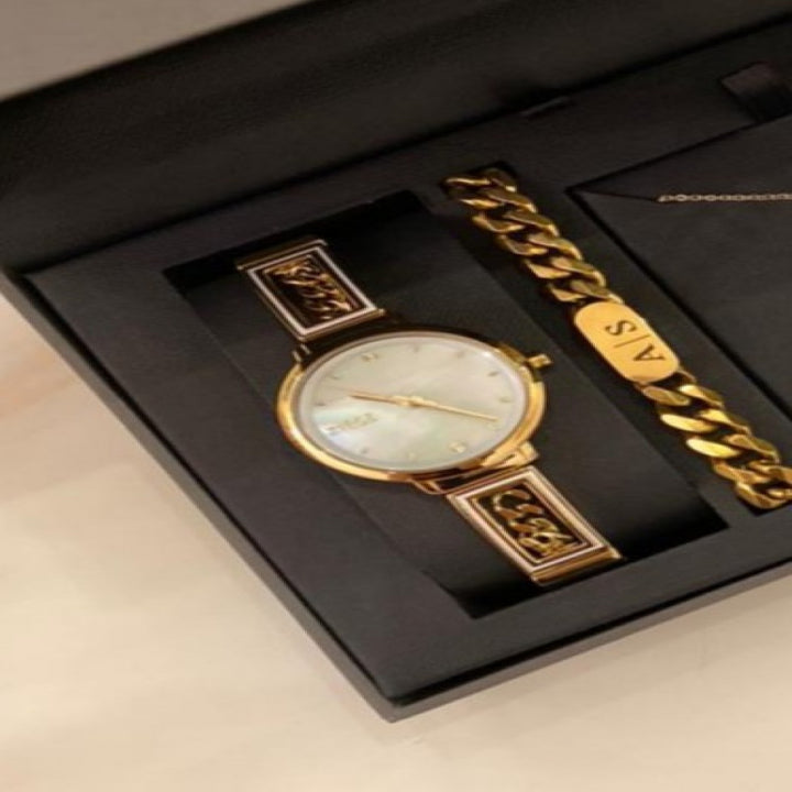 طقم ناعم مطلي ذهب_أسورة_سلسال_ساعة_صمم بفخامة ليعكس جاذبيتك