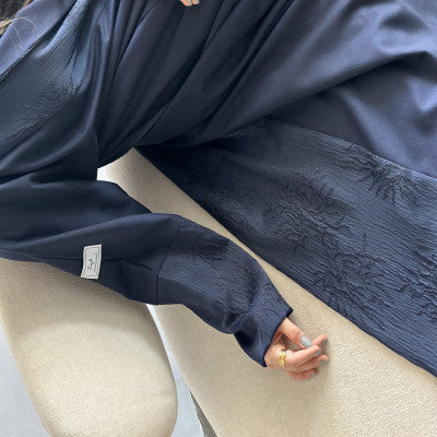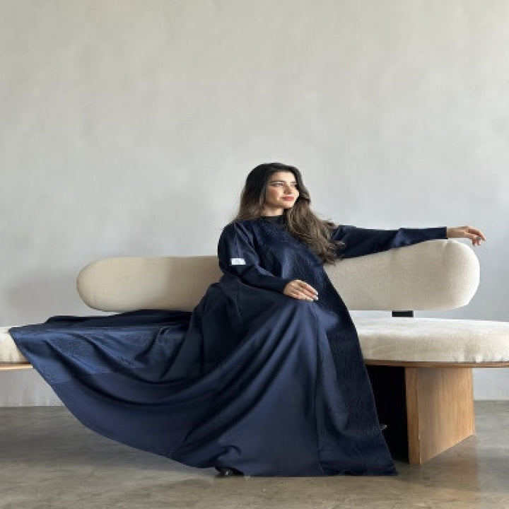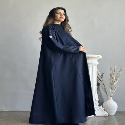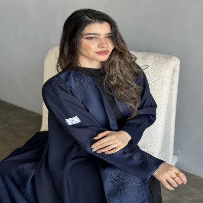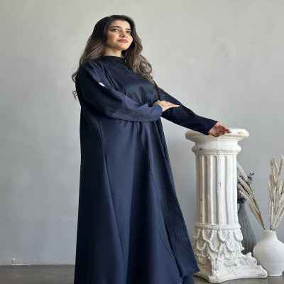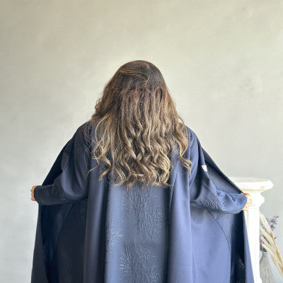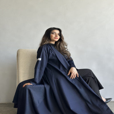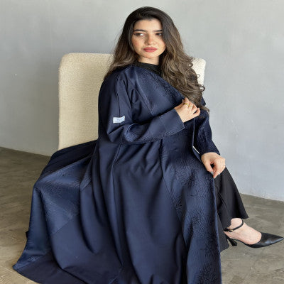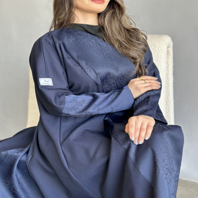 عباية ملونة فخمة بلون كحلي انيق مصنوعة من قماش كتان هندي عالي الجودة مع تفاصيل لامعه و مشجرة علي العباية من الامام والخلف و الاكمام .