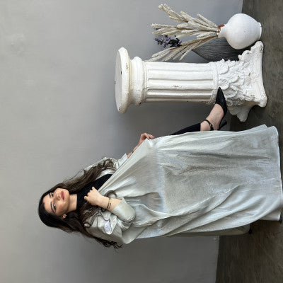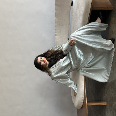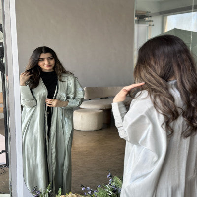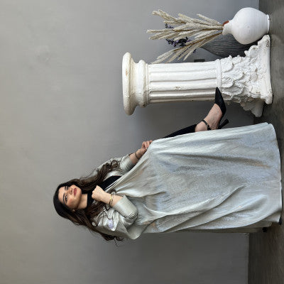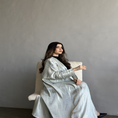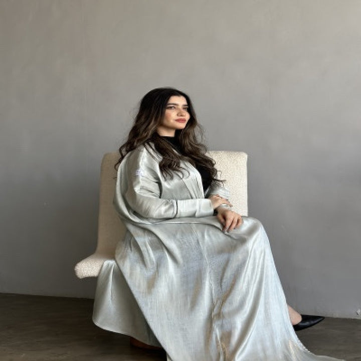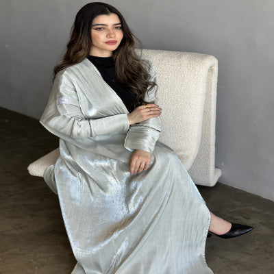 عباية لامعة بلون فضي مميز وملمس حريري ناعم تصميم انيق و مع لون رائع و شريط اسود لامع على الاكمام واطراف العباية تمنحك اطلالة فاخرة تليق بالمناسبات الخاصة .