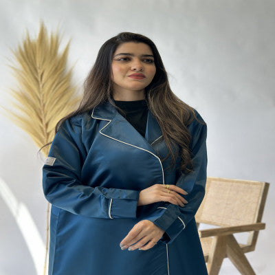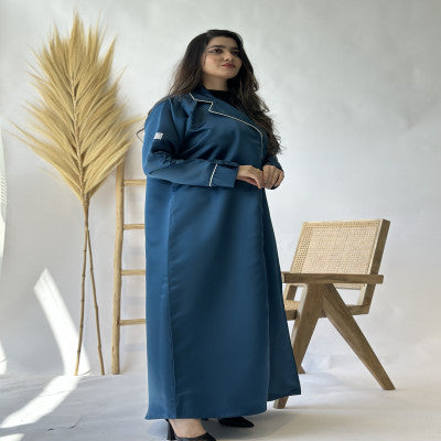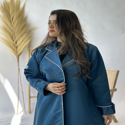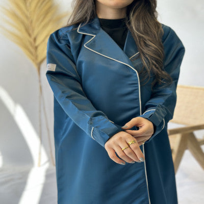 عباية زرقاء فاتح بألوان البحر الساحرة تاتي بقصة بليزر انيقة مع شريط أبيض على الأكمام و اطراف العباية، تلائم ذوق المرأة العصرية .عبايه تفته رسميه بتصميم بليزر مع قيطان ابيض,يوميه و عمليه ومناسبه للسفر