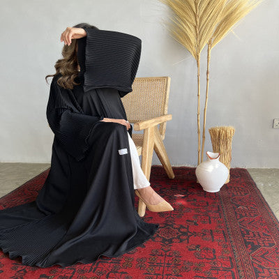 عبايه بقماش راما مع قصه كلوش جانبيه بليسيه كسرات مع اكمام بليسيه كسرات فخمه للمرأه الانيقه