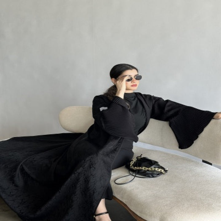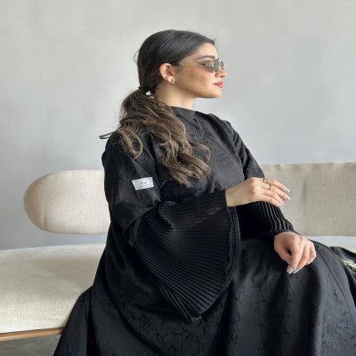 عباية بليسيه بلون اسود ملكي وتفاصيل مشجرة على كامل العبايه مع اكمام بليسه مكسره، عباية فاخرة تناسب جميع إطلالاتك.
