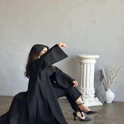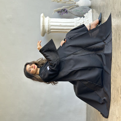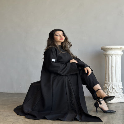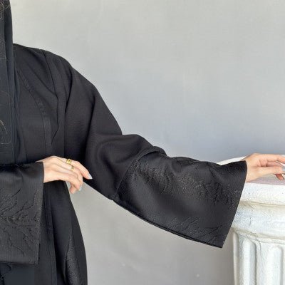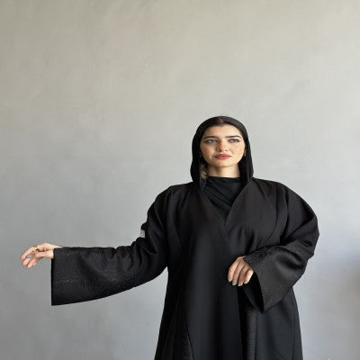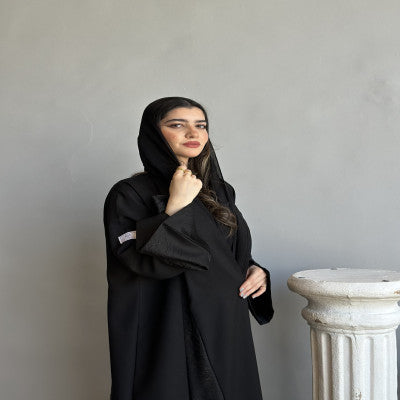 عباية رويال بلون اسود ملكي وقماش كتان مشجر على الاكمام وجوانب العبايه من الامام والخلف