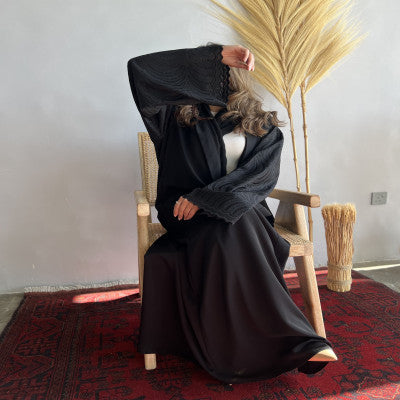 عباية سادل باللون الاسود الملكي وبتفاصيل من التخريم المميز على الاكمام