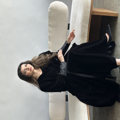 عباية من المخمل الاسود الملكي مع الفستان المخملي الداخلي المتناسق وبتفاصيل مشجره على الاكمام