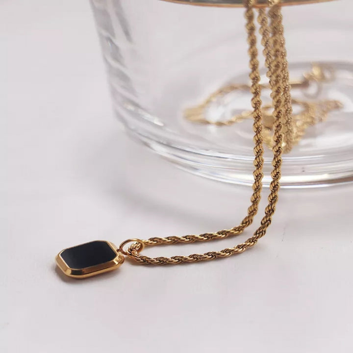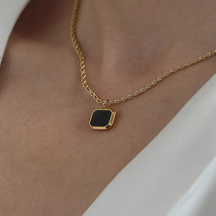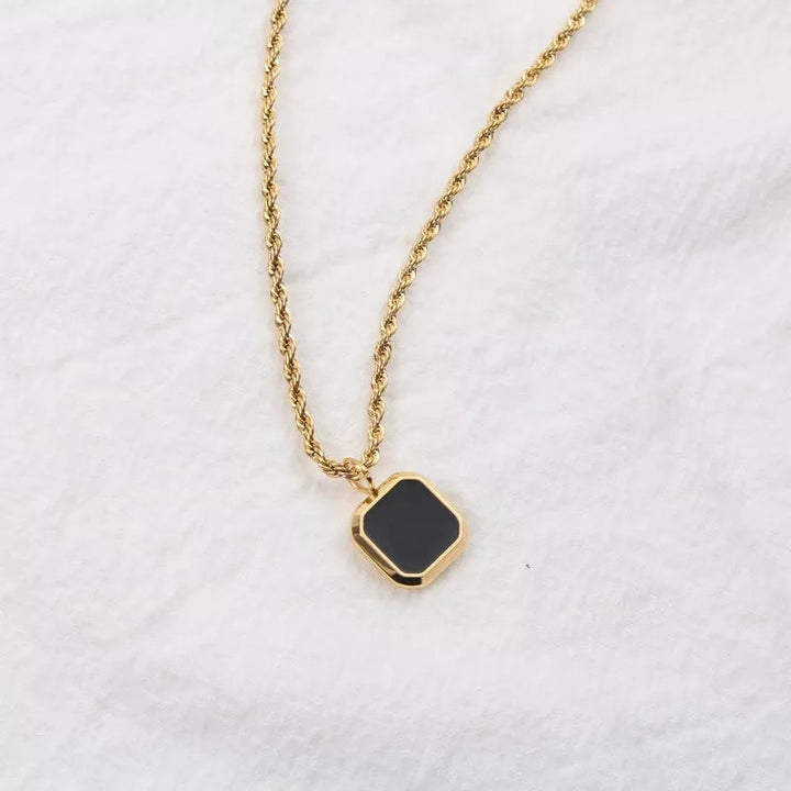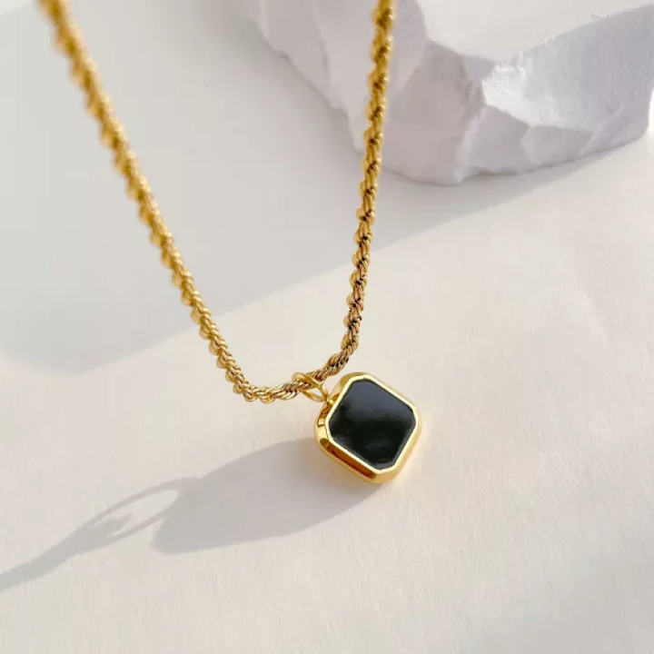 هذه القلادة المطلية بالذهب لها طبقة من الرخام ، والقلادة على شكل مربع باللون الأسود. ارتديه مع ملابسك الأكثر أناقة للحصول على مكمل مثالي ، أو لإطلالة يومية ، ارتديه مع قميص وبنطلون جينز بسيط.