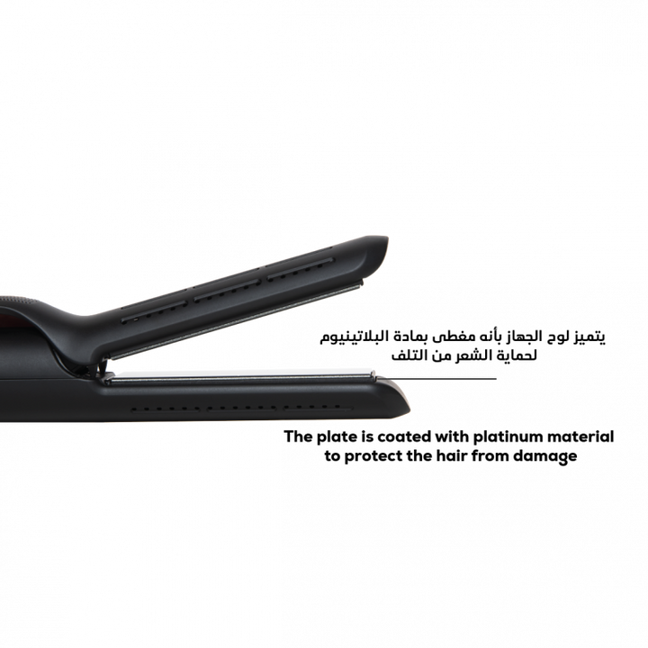 - يتميز لوح الجهاز بأنه مغطى بمادة البلاتينيوم لحماية الشعر من التلف.