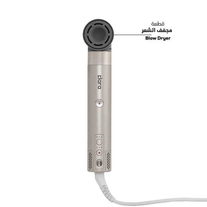 1- بكل سهولة ثبتي ملحق التصفيف المفضل، ثم اختيار مستوى الحرارة والهواء المطلوب.