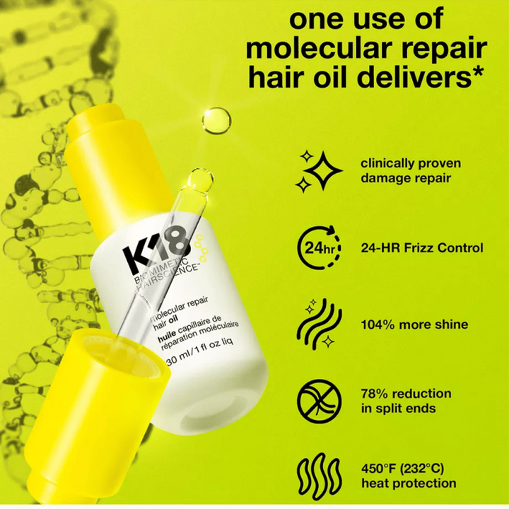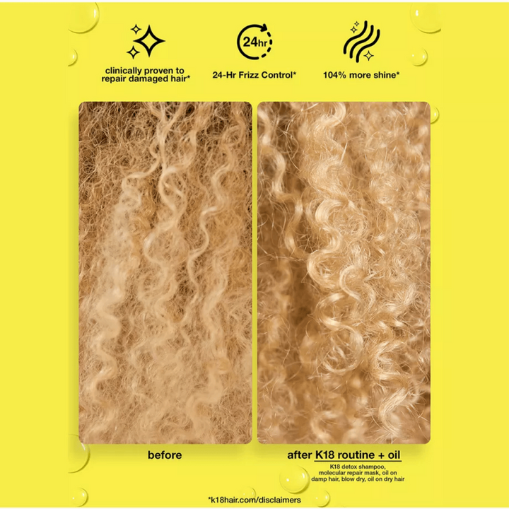 سواء كان شعرك معالجًا كيميائيًا أو تالفًا بالحرارة أو جافًا بشكل طبيعي، فإن زيت الشعر الإصلاحي الجزيئي K18 هو الحل الأمثل.