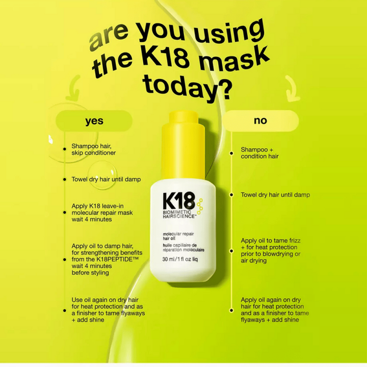 *يمكن أيضًا استخدام زيت الشعر للإصلاح الجزيئي في الأيام التي لا تستخدم فيها قناع K18 الذي يترك على الشعر، ببساطة قم بالشامبو والبلسم والتجفيف بالمنشفة ثم ضعي 1-3 قطرات من زيت الإصلاح الجزيئي K18.