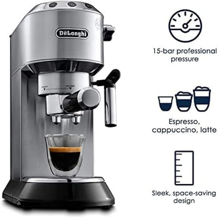 ماكينة تحضير قهوة باريستا بمضخة اسبريسو ديديكا من ديلونجي لتحضير امريكانو وكابتشينو ولاتيه وماكياتو واسبريسو EC685.M فضي