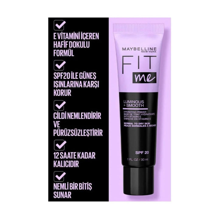 برايمر فيت مي لومينوس + سموث غني بعوامل مرطبة تُرطّب بشرتكِ، مما يضمن لكِ لمسة نهائية ندية تبدو منتعشة وشابة.
