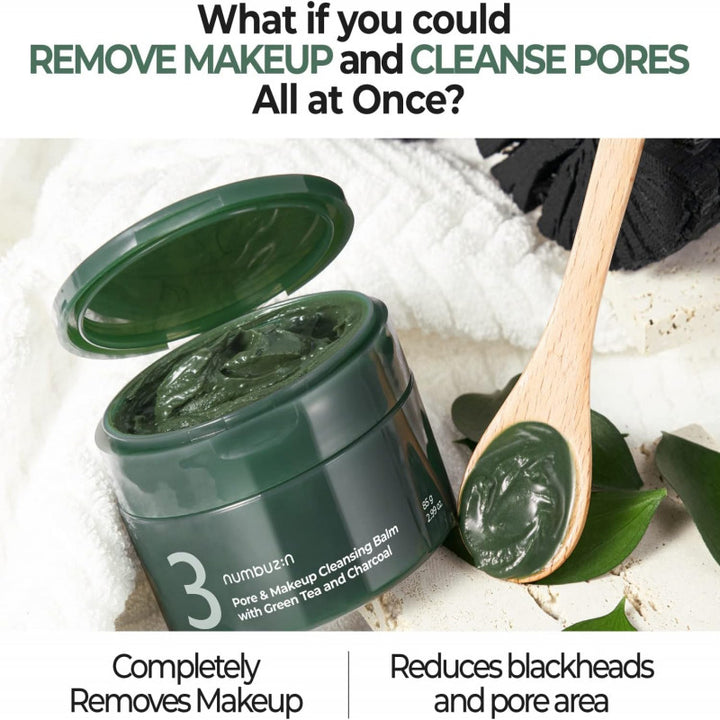 بلسم تنظيف المسام والمكياج رقم 3 من نمبوزين مع إضافة الشاي الأخضر والفحم يزيل المكياج الثقيل مع تنظيف ملمس البشرة.