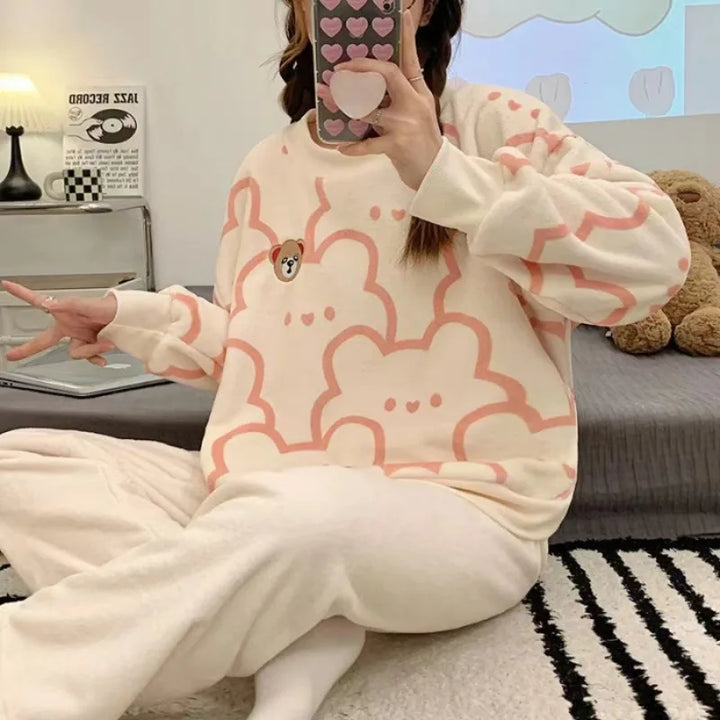 طقم بيجامة نسائي خريفي من قطعتين – من الفرو الناعم بتصميم دافئ بأكمام طويلة وياقة دائرية