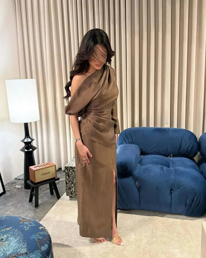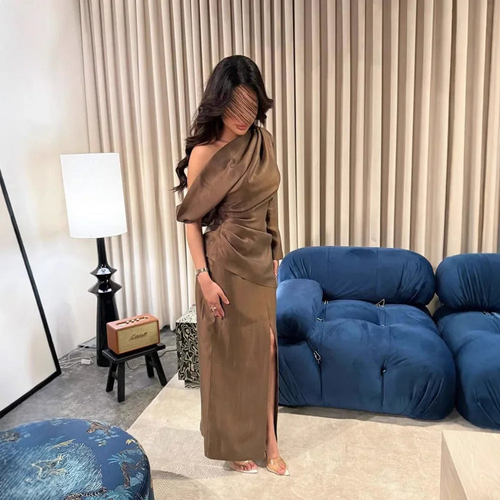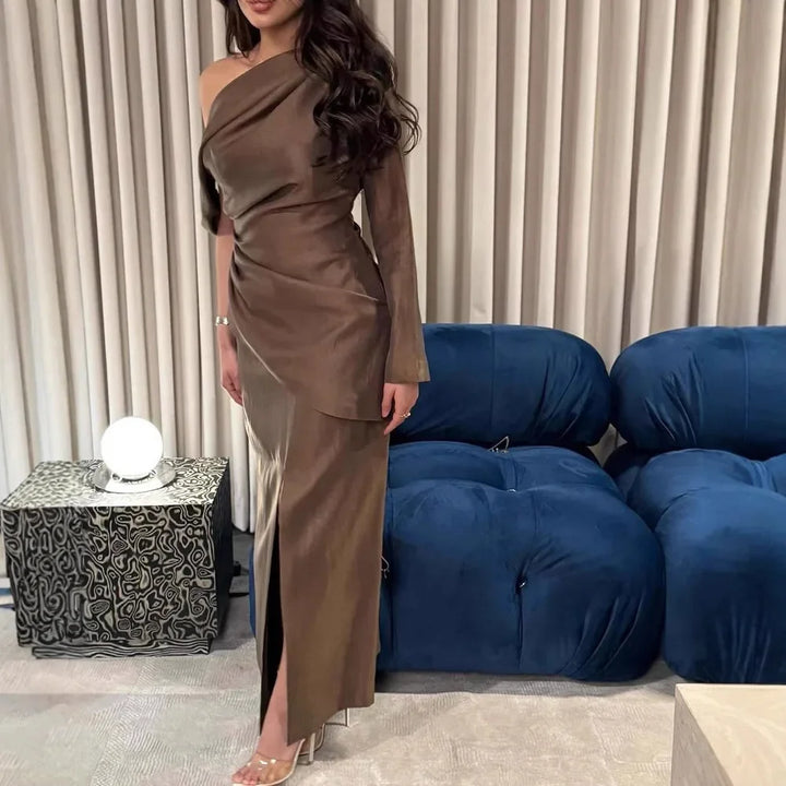 فستان سهرة | أنيق من ألياف البوليستر بأكمام طويلة وكسرات وكتف واحد