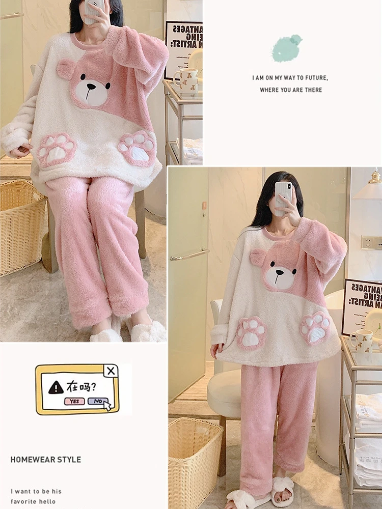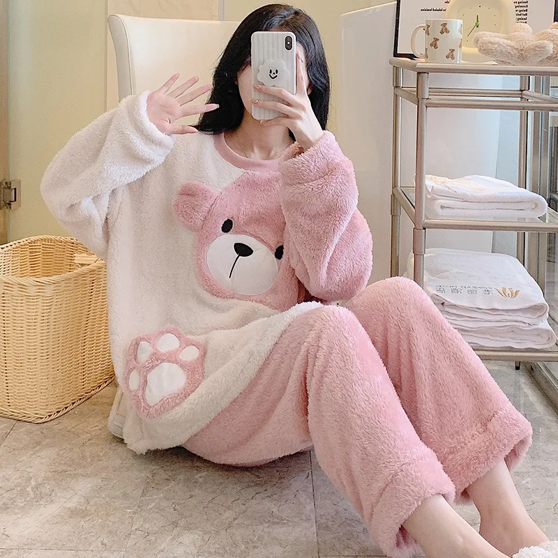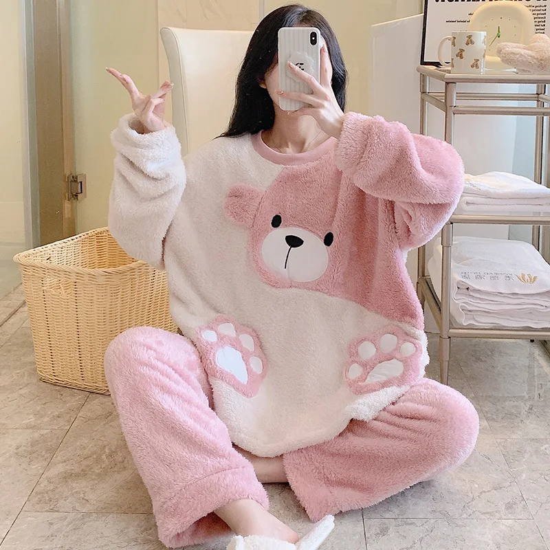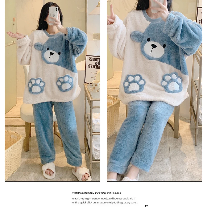 طقم بيجامة نسائي شتوي ناعم – مقاس واسع بتصميم كارتوني لطيف ودافئ لفصلي الخريف والشتاء