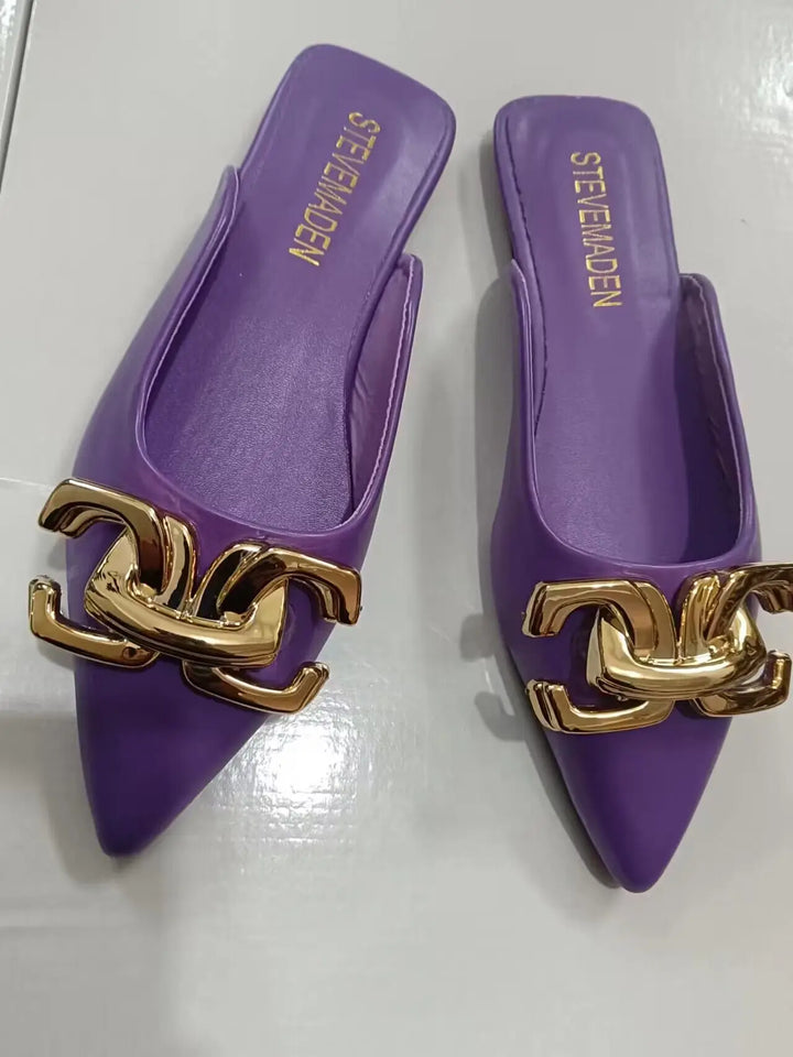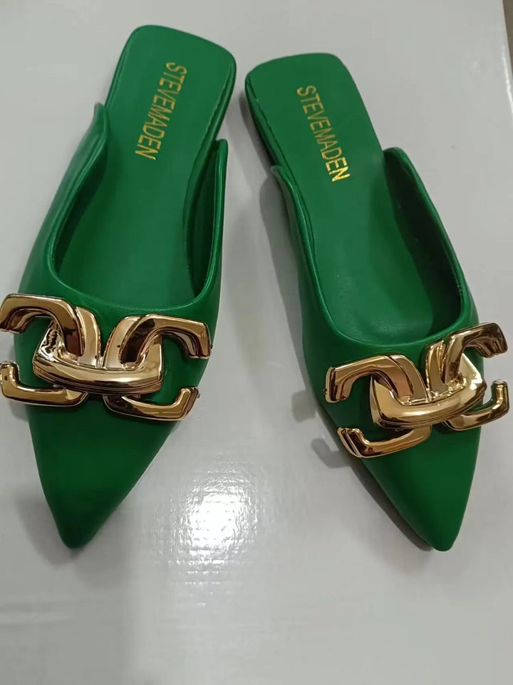 صندل صيفي فاخر مصمم بسلسلة معدنية مسطح بأصابع مدببة