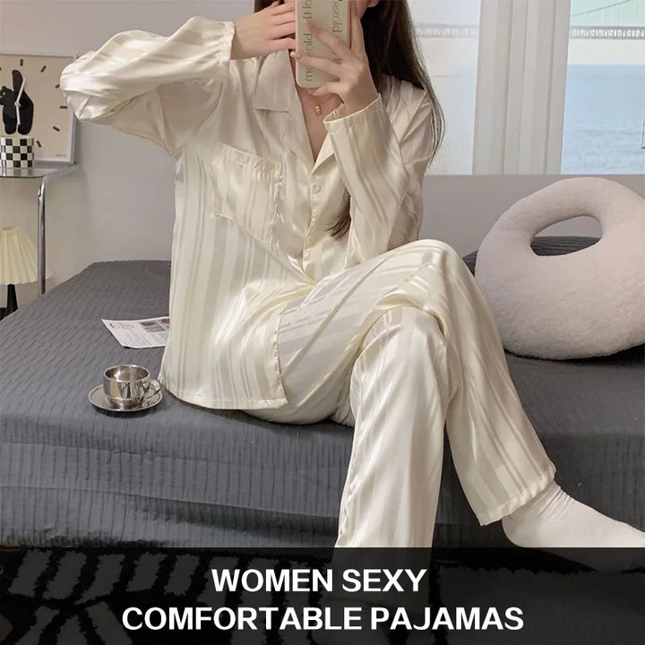 بجامة نوم نسائي حرير وساتان بأكمام طويلة وبنطلون